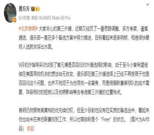 但对北京男篮来说,曾凡博这个选择就不是那么好了。球队主教练许利民不止在一次接受采访时表示,球队在选择外援时会考虑曾凡博的选择,这也导致北京男篮到目前为止只签下了一大一小两名外援,就是在等曾凡博。但曾凡博最终还是坚持去美国寻找机会,那么北京男篮在外援选择方面也就有了决策了。按照勇方方的说法,目前北京男篮已经不再考虑曾凡博是否能够回归的问题,也并不拘泥于为他寻找一名替身,而是根据新赛季球队的战术需要、阵容相对的短板以及伤病影响等去考虑第三外援的位置特点。也就是说,北京男篮在外援选择方面已经进行了调整,虽然时间上已经有些晚了,但至少还有一个月多一点的时间,还是有时间操作的。